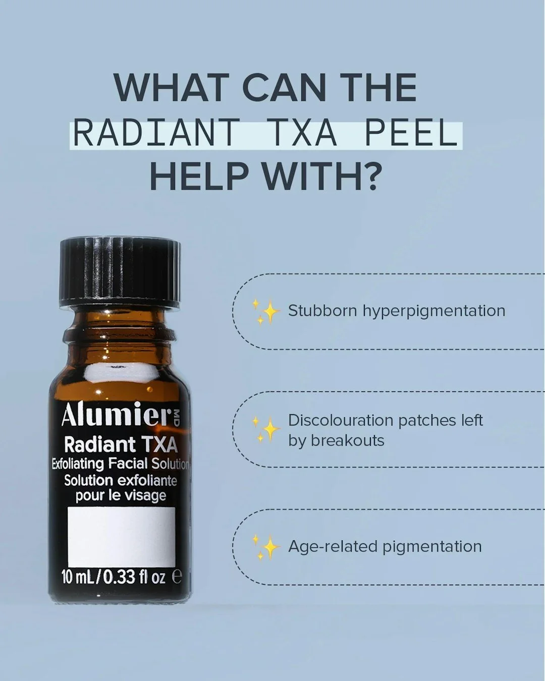 Alumier MD’s newest peel, Radiant TXA, a skin-brightening powerhouse designed to tackle uneven tone and dullness with a gentle yet effective multi-acid blend: